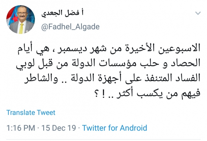 وكتب الجعدي، في تغريدة له عبر موقع التواصل الاجتماعي "تويتر"، تابعها المشهد العربي: "الأسبوعان الأخيران من شهر ديسمبر، هما أيام الحصاد وحلب مؤسسات الدولة من قبل لوبي الفساد المتنفذ على أجهزة الدولة".