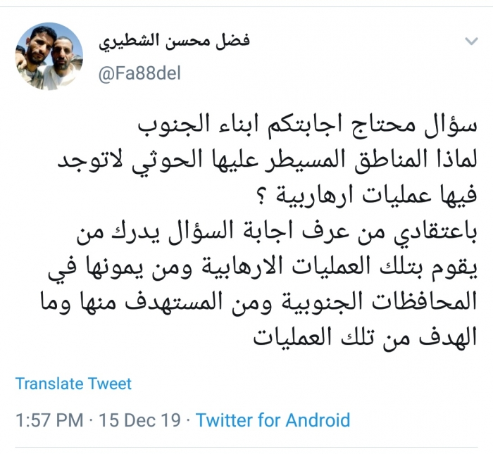 وكتب الشطيري، في تغريدة له عبر موقع التواصل الاجتماعي تويتر، تابعها المشهد العربي: "سؤال محتاج إجابتكم أبناء الجنوب.. لماذا المناطق المسيطر عليها الحوثي لاتوجد فيها عمليات إرهاربية ؟".