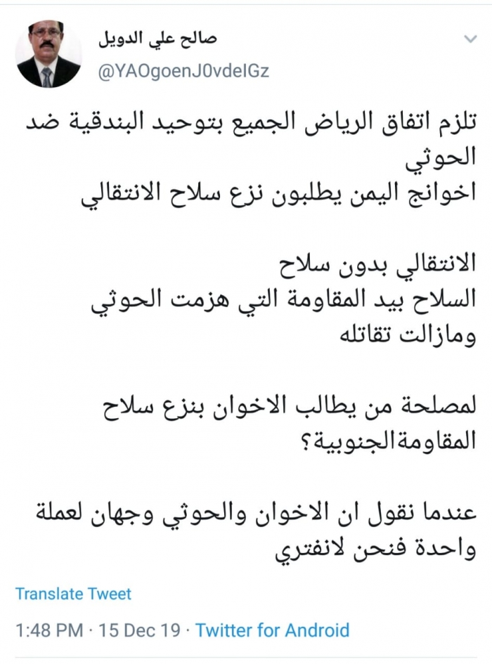 وكتب الدويل، في تغريدة له عبر موقع التواصل الاجتماعي تويتر، تابعها المشهد العربي: "يلزم اتفاق الرياض الجميع بتوحيد البندقية ضد الحوثي".