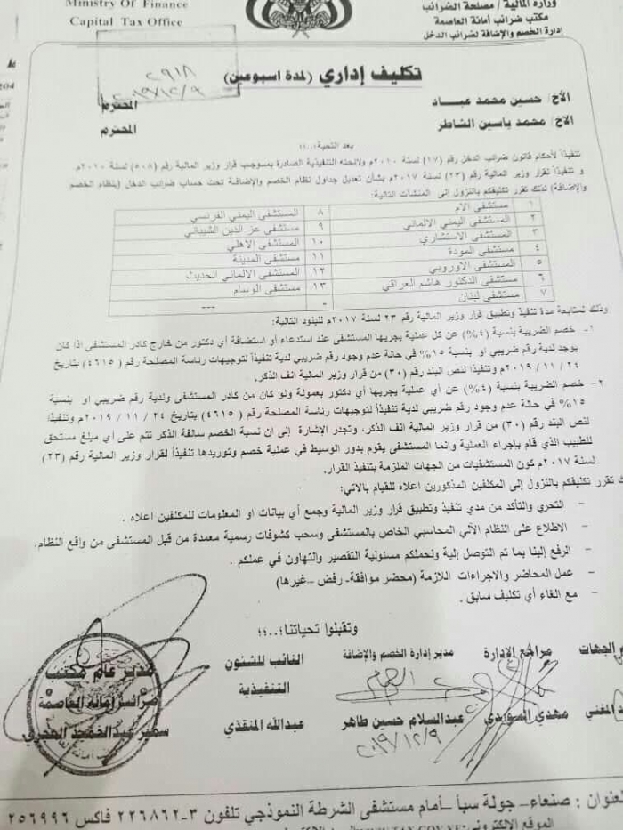 ورصدت قناة العربية، نقلا عن مصدر، يعمل بأحد المستشفيات الخاصة، أن مصلحة الضرائب بصنعاء الخاضعة لسيطرة المليشيات شكّلت لجنة للنزول إلى المستشفيات الخاصة في المدينة، وإلزام إداراتها بتنفيذ قرار وزارة المالية بحكومة الحوثيين غير المعترف بها دولياً، بخصم ضريبة دخل عن كل عملية يجريها المستشفى عند استضافته أطباء من الخارج بمقابل.