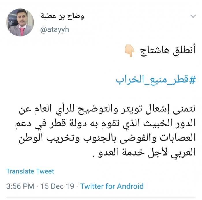 وكتب عضو الجمعية الوطنية الجنوبية، وضاح بن عطية، في تغريدة له عبر موقع التواصل الاجتماعي تويتر، تابعها المشهد العربي: "نتمنى إشعال تويتر والتوضيح للرأي العام عن الدور الخبيث الذي تقوم به دولة قطر في دعم العصابات والفوضى بالجنوب وتخريب الوطن العربي لأجل خدمة العدو".