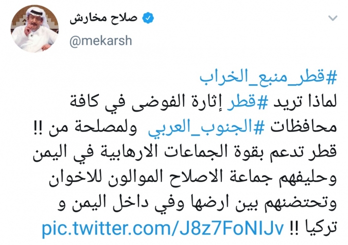 تفاعل السياسي السعودي، صلاح مخارش، مع هاشتاج "قطر منبع الخراب"، لفضح ممارسات قطر في الجنوب العربي.