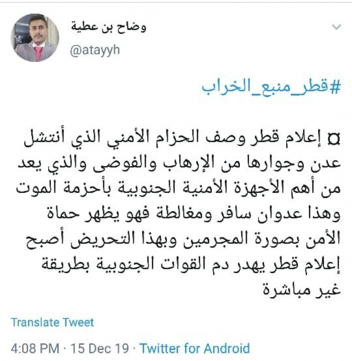 شن عضو الجمعية الوطنية الجنوبية، وضاح بن عطية، هجوما لاذعا على إعلام قطر، من خلال هاشتاج "قطر منبع الخراب".