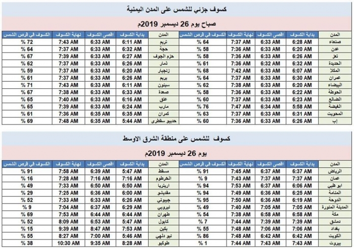 جددت الجهات المعنية تحذيرها من موجة كسوف متوقعة للشمس الخميس الموافق 26 ديسمبر بعدد من مدن الجنوب والشمال.