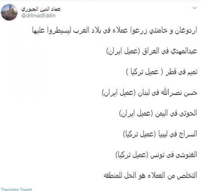 وقال في تغريدة عبر "تويتر" رصدها "المشهد العربي": "أردوغان وخامنئي زرعوا عملاء في بلاد العرب ليسيطروا عليها عبدالمهدي فى العراق (عميل إيران).. تميم في قطر (عميل تركيا).. حسن نصرالله فى لبنان (عميل إيران).. الحوثي في اليمن (عميل إيران)".