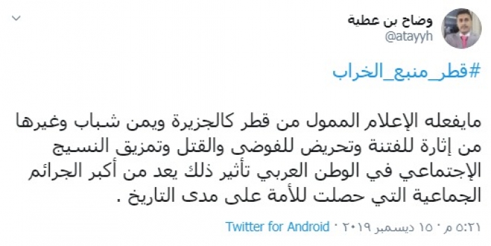وقال في تغريدة عبر "تويتر" رصدها "المشهد العربي": "قطر منبع الخراب.. ما يفعله الإعلام الممول من قطر كالجزيرة ويمن شباب وغيرها من إثارة للفتنة وتحريض للفوضى والقتل وتمزيق النسيج الإجتماعي في الوطن العربي تأثير ذلك يعد من أكبر الجرائم الجماعية التي حصلت للأمة على مدى التاريخ".