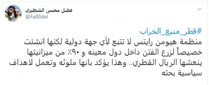 وقال في تغريدة عبر "تويتر" رصدها "المشهد العربي": "قطر منبع الخراب منظمة هيومن رايتس لا تتبع لأي جهة دولية لكنها أنشأت خصيصاً لزرع الفتن داخل دول معينة و ٩٠٪ من ميزانيتها ينعشها الريال القطري.. وهذا يؤكد بأنها ملوثة وتعمل لأهداف سياسية بحتة".