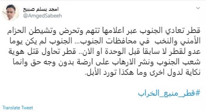 وكتب في تغريدة عبر "تويتر" رصدها "المشهد العربي": "قطر تعادي الجنوب عبر إعلامها تتهم وتحرض وتشيطن الحزام الأمني والنخب في محافظات الجنوب.. الجنوب لم يكن يوما عدو لقطر لا سابقًا قبل الوحدة أو الآن.. قطر تحاول قتل هوية شعب الجنوب ونشر الإرهاب على أرضه بدون وجه حق وإنما نكاية لدول أخرى وما هكذا تورد الأبل".