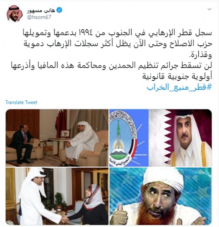 وقال في تغريدة عبر "تويتر" رصدها "المشهد العربي": "سجل قطر الإرهابي في الجنوب من ١٩٩٤ بدعمها وتمويلها حزب الاصلاح وحتى الآن يظل أكثر سجلات الإرهاب دموية وقذارة. لن تسقط جرائم تنظيم الحمدين ومحاكمة هذه المافيا وأذرعها أولوية جنوبية قانونية".