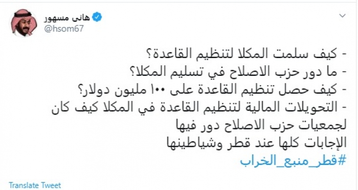 وقال في تغريدة عبر "تويتر" رصدها "المشهد العربي": " كيف سلمت المكلا لتنظيم القاعدة؟.. ما دور حزب الإصلاح في تسليم المكلا؟.. كيف حصل تنظيم القاعدة على ١٠٠ مليون دولار؟.. التحويلات المالية لتنظيم القاعدة في المكلا كيف كان لجمعيات حزب الإصلاح دور فيها.. الإجابات كلها عند قطر وشياطينها".