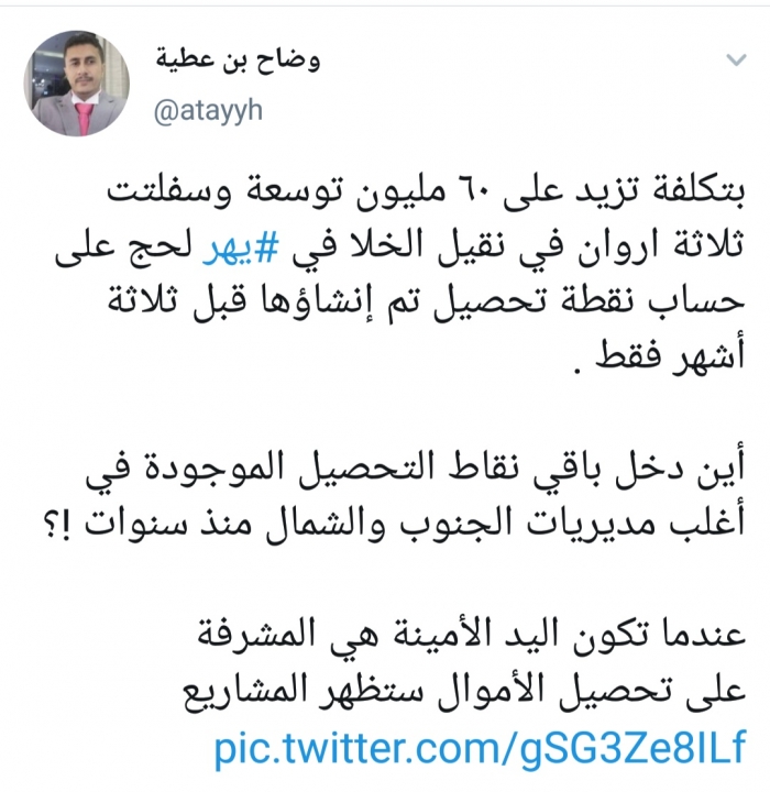 وكتب بن عطية، في تغريدة له عبر موقع التواصل الاجتماعي تويتر، تابعها المشهد العربي: "بتكلفة تزيد على ٦٠ مليون توسعة وسفلتة ثلاثة أروان في نقيل الخلا في يهر لحج على حساب نقطة تحصيل تم إنشاؤها قبل ثلاثة أشهر فقط".