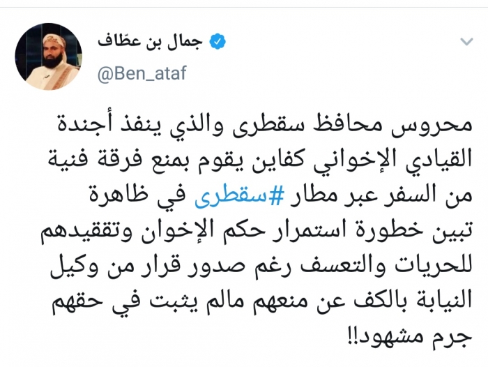 وكتب بن عطاف، في تغريدة له عبر موقع التواصل الاجتماعي تويتر، تابعها المشهد العربي: "محروس محافظ سقطرى والذي ينفذ أجندة القيادي الإخواني كفاين يقوم بمنع فرقة فنية من السفر عبر مطار سقطرى".