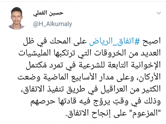 وكتب القملي، في تغريدة له على موقع التواصل الاجتماعي تويتر، تابعها المشهد العربي: "أصبح اتفاق الرياض على المحك في ظل العديد من الخروقات التي ترتكبها المليشيات الإخوانية التابعة للشرعية في تمرد مُكتمل الأركان".