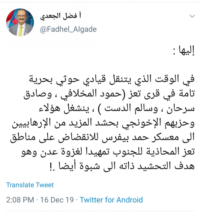 أكد عضو هيئة رئاسة المجلس الانتقالي الجنوبي، فضل الجعدي، أن مليشيات الإخوان تحشد الإرهابيين لغزو عدن وشبوة.