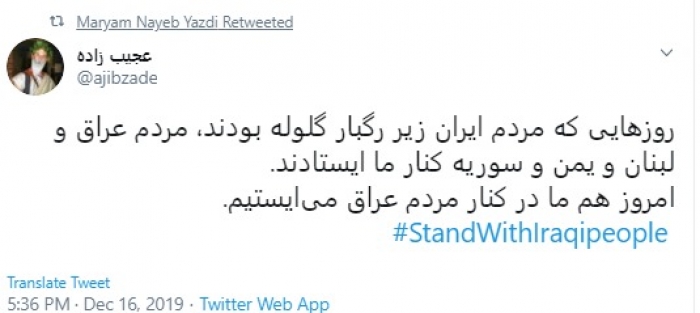 أعلن الناشط الإيراني عجيب زادة، اليوم، تضامنه الكامل مع الشعب العراقي وذلك بعد الانتفاضة التي يشهدها بلاد الرافدين ضد فساد السلطة وتحكم المليشيات الإيرانية في الحكم.