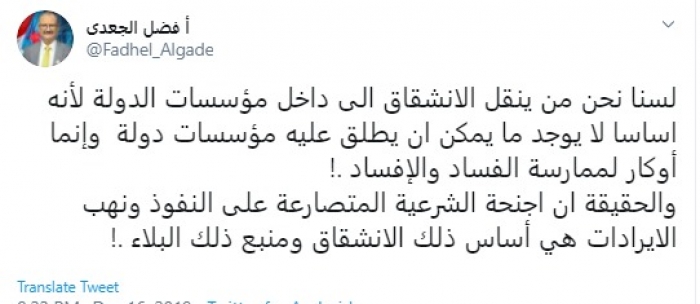 وأضاف: "والحقيقة أن أجنحة الشرعية المتصارعة على النفوذ ونهب الإيرادات هي أساس ذلك الانشقاق ومنبع ذلك البلاء".