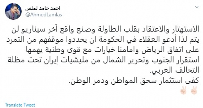 وقال في تغريدة عبر "تويتر" رصدها "المشهد العربي": " الاستهتار والاعتقاد بقلب الطاولة وصنع واقع آخر سيناريو لن يتم لذا أدعو العقلاء في الحكومة أن يحددوا موقفهم من التمرد على اتفاق الرياض وأمامنا خيارات مع قوى وطنية يهمها استقرار الجنوب وتحرير الشمال من مليشيات إيران تحت مظلة التحالف العربي. كفى استثمار سحق المواطن ودمر الوطن".