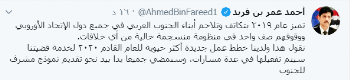 وكتب بن فريد عبر "تويتر":" تميز عام ٢٠١٩ بتكاتف وتلاحم أبناء الجنوب العربي في جميع دول الإتحاد الأوروبي ووقوفهم صفا واحدا في منظومة منسجمة خالية من أي خلافات".