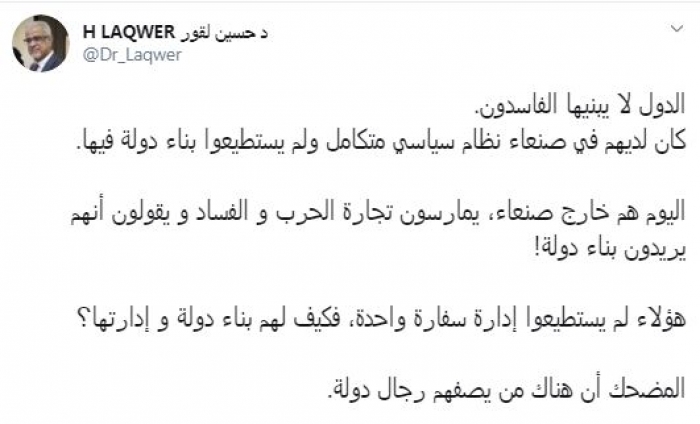 وأضاف: "اليوم هم خارج صنعاء، يمارسون تجارة الحرب و الفساد و يقولون أنهم يريدون بناء دولة! هؤلاء لم يستطيعوا إدارة سفارة واحدة، فكيف لهم بناء دولة و إدارتها؟ المضحك أن هناك من يصفهم رجال دولة".