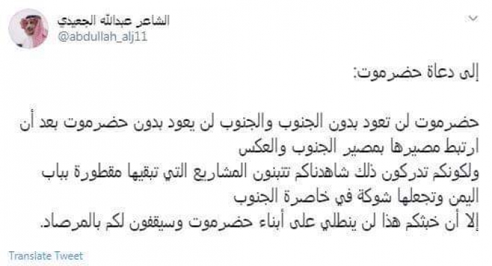 وجه الشاعر عبدالله الجعيدي، اليوم، رسالة هامة إلى دعاة حضرموت، مؤكدًا أن "حضرموت لن تعود بدون الجنوب والجنوب لن يعود بدون حضرموت بعد أن ارتبط مصيرها بمصير الجنوب والعكس".