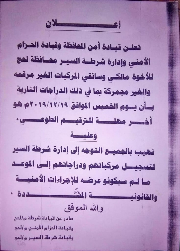 أمهلت إدارة أمن لحج، وشرطة المرور بالمحافظة، مالكي وسائقي الدراجات النارية والمركبات غير المرخصة، إلى يوم الخميس المقبل، لبدء إجراءات ترخيصها.