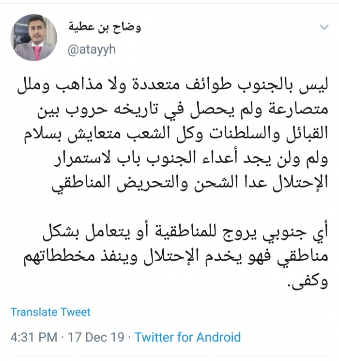 وكتب بن عطية، في تغريدة له عبر موقع التواصل الاجتماعي تويتر، تابعها المشهد العربي: "ليس بالجنوب طوائف متعددة ولا مذاهب وملل متصارعة ولم يحصل في تاريخه حروب بين القبائل والسلطنات".