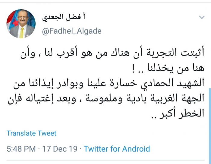 أكد عضو هيئة رئاسة المجلس الانتقالي الجنوبي، فضل الجعدي، أن عملية اغتيال قائد اللواء 35 مدرع، العميد الركن عدنان الحمادي، بوادر لإيذاء الجنوب من الجهة الغربية.