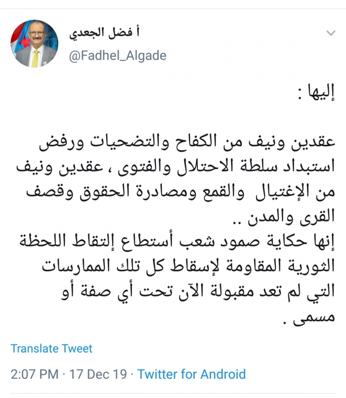 وكتب الجعدي، في تغريدة له عبر موقع التواصل الاجتماعي تويتر، تابعها المشهد العربي: "عقدان ونصف من الكفاح والتضحيات ورفض استبداد سلطة الاحتلال والفتوى".