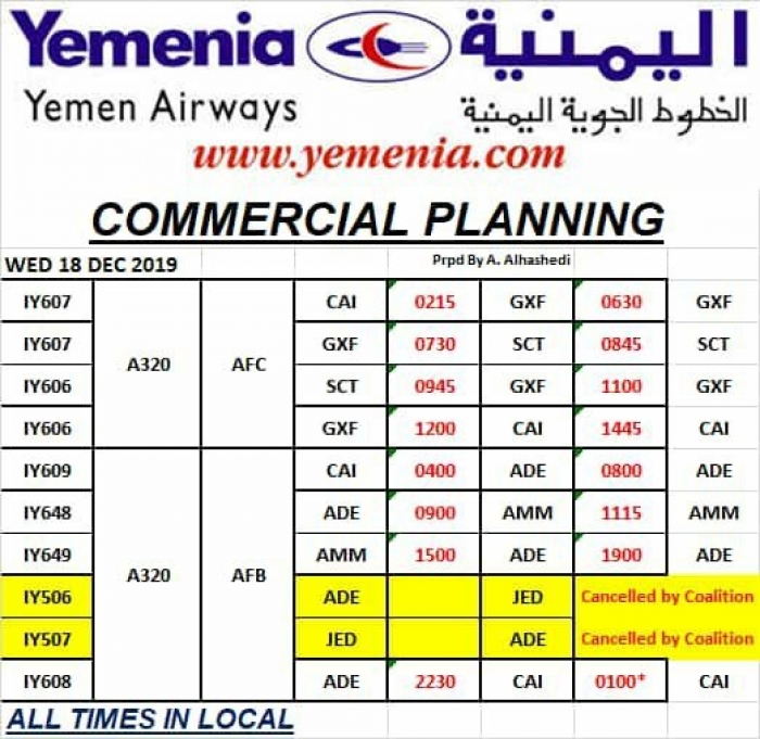 ينشر "المشهد العربي" مواعيد رحلات طيران اليمنية غداً الأربعاء، الموافق 18 ديسمبر 2019.