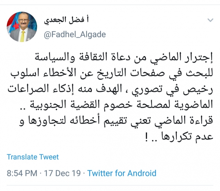 وكتب الجعدي، في تغريدة له عبر موقع التواصل الاجتماعي تويتر، تابعها المشهد العربي: "إجترار الماضي من دعاة الثقافة والسياسة للبحث في صفحات التاريخ عن الأخطاء أسلوب رخيص في تصوري، والهدف منه إذكاء الصراعات الماضوية لمصلحة خصوم القضية الجنوبية".