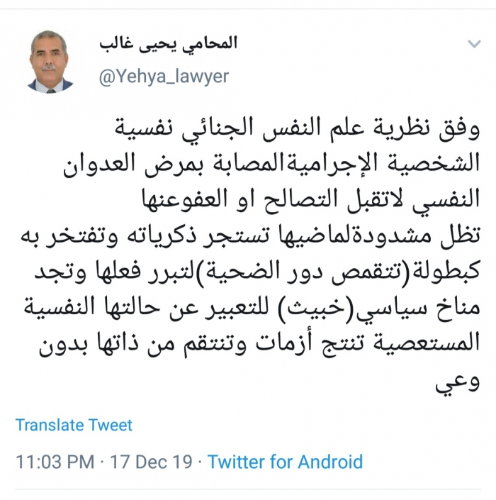 وكتب غالب، في تغريدة له عبر موقع التواصل الاجتماعي تويتر، تابعها المشهد العربي: "وفق نظرية علم النفس الجنائي نفسية الشخصية الإجرامية المصابة بمرض العدوان النفسي لاتقبل التصالح أو العفو عنها".