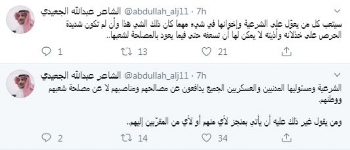 وأضاف في تغريدة أخرى: "سيتعب كل من يعوّل على الشرعية وإخوانها في شيء مهما كان ذلك الشي هذا وأن لم تكون شديدة الحرص على خذلانه وأذيته لا يمكن لها أن تسعفه حتى فيما يعود بالمصلحة لشعبها".
