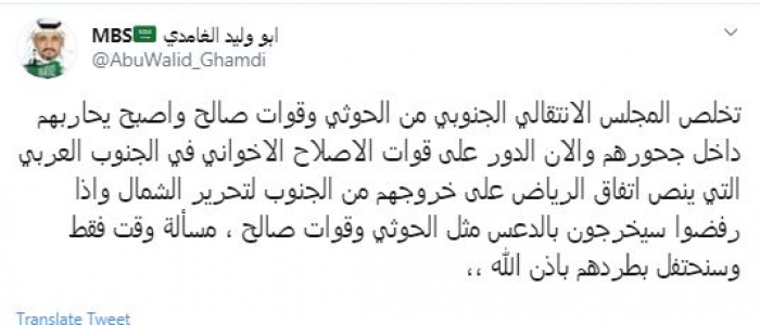وجه الناشط السياسي السعودي أبو وليد الغامدي، اليوم، تحذيرًا ناريًا لمليشيات الإصلاح وذلك بعد خرقها لبنود اتفاق الرياض، وقيامها بالعديد من الانتهاكات بحق أبناء الجنوب.