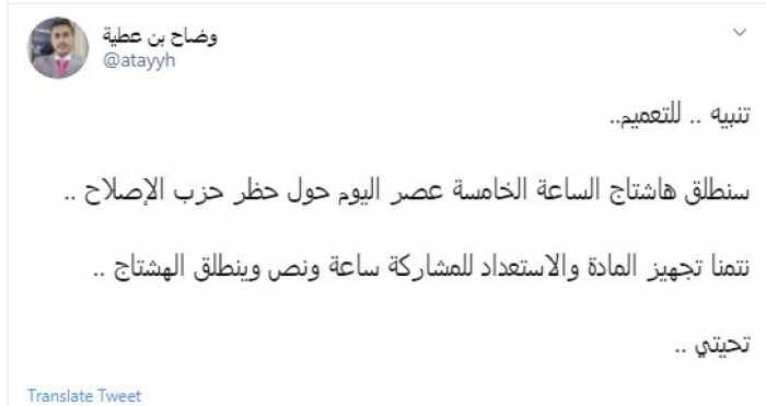 أعلن الكاتب الصحفي وضاح بن عطية، اليوم، إطلاق هاشتاج حول حظر حزب الإصلاح.