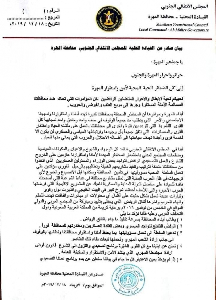 وطالبت القيادة المحلية للانتقالي في بيان لها، بسرعة تنفيذ ما جاء باتفاق الرياض، وضرورة وقوف السلطة إلى جانب إرادة الشعب المهري.