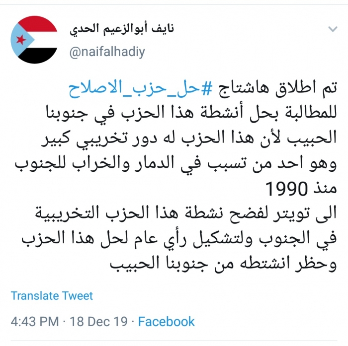 وكتب الحدي، في تغريدة له عبر موقع التواصل الاجتماعي تويتر، تابعها المشهد العربي: "تم إطلاق هاشتاج: حل حزب الاصلاح، للمطالبة بحل أنشطة هذا الحزب في جنوبنا الحبيب لأن هذا الحزب له دور تخريبي كبير وهو أحد من تسبب في الدمار والخراب للجنوب منذ 1990".