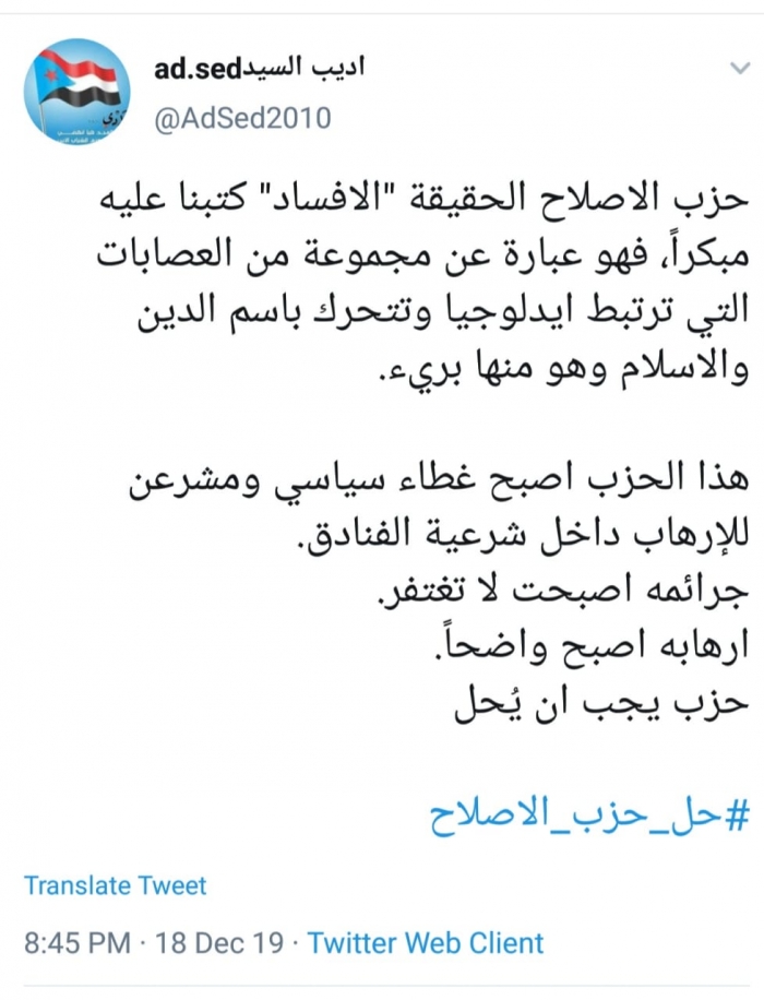 وكتب السيد، في تغريدة له على موقع التواصل الاجتماعي تويتر، تابعها المشهد العربي: "حزب الإصلاح كتبنا عليه مبكراً، فهو عبارة عن مجموعة من العصابات التي ترتبط أيدلوجيا وتتحرك باسم الدين والإسلام وهو منها بريء".