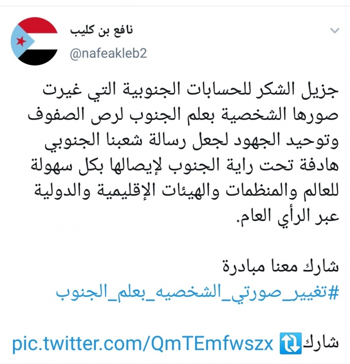 وجه الناشط السياسي، نافع بن كليب، الشكر إلى كل الحسابات الجنوبية التي قامت بتغيير صورها الشخصية بعلم الجنوب، بناءا على دعوته لذلك في تغريدات سابقة.