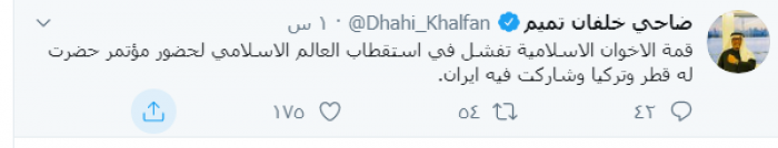وكتب خلفان في تغريدة عبر "تويتر"، رصدها "المشهد العربي":"قمة الإخوان الإسلامية تفشل في استقطاب العالم الإسلامي لحضور مؤتمر حضرت له قطر وتركيا وشاركت فيه إيران".
