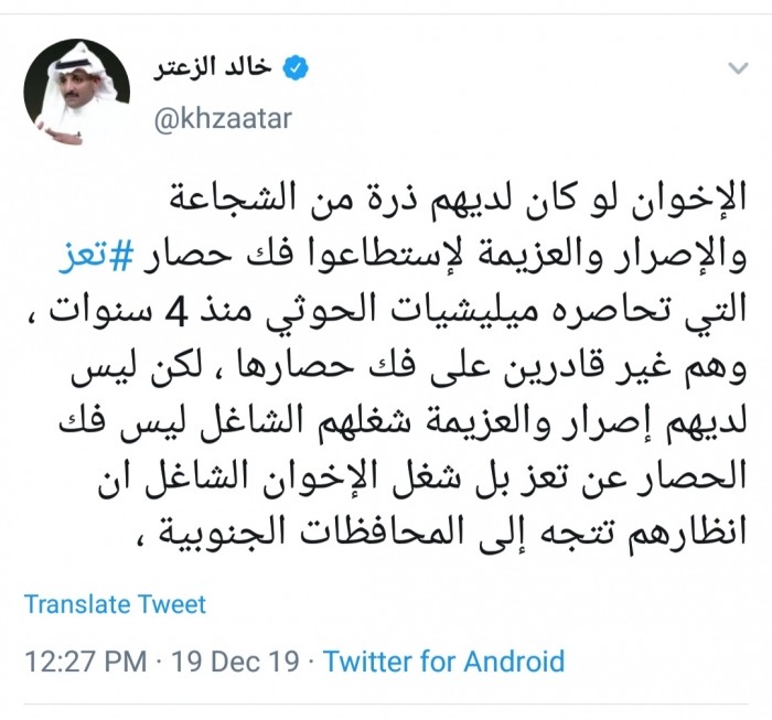 وكتب الزعتر، في تغريدة له على موقع التواصل الاجتماعي تويتر، تابعها المشهد العربي: "الإخوان لو كان لديهم ذرة من الشجاعة والإصرار والعزيمة لاستطاعوا فك حصار تعز التي تحاصره ميليشيات الحوثي منذ 4 سنوات".