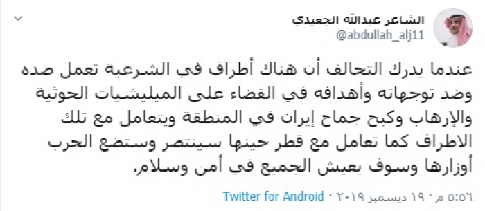 وجه الشاعر عبد الله الجعيدي، رسالة للتحالف العربي، مفادها أنه سينتصر إذا أدرك أن هناك أطراف في ما تسمى الشرعية ضده ولا تدين له بالولاء، موضحاً أن من أسباب الانتصار القضاء على المشروع الإيراني.