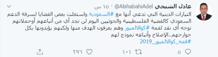 وكتب الشبحي عبر تغريدة له على "تويتر" رصدها "المشهد العربي":"التيارات الدينية التي تدعي أنها مع السعودية واستغلت بعض القضايا لسرقة الدعم السعودي كالقضية الفلسطينية والحوثيين اليوم لن تجد أي من أتباعهم أو حملاتهم توجه أي نقد لقمة كوالالمبور".