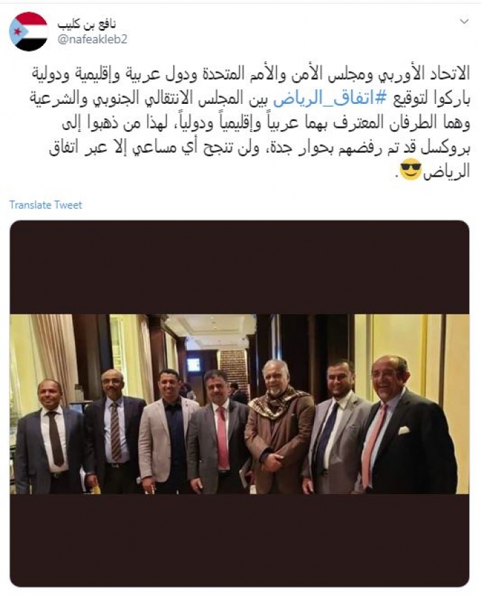 وقال في تغريدة عبر "تويتر" رصدها "المشهد العربي": "الاتحاد الأوربي ومجلس الأمن والأمم المتحدة ودول عربية وإقليمية ودولية باركوا لتوقيع اتفاق الرياض بين المجلس الانتقالي الجنوبي والشرعية وهما الطرفان المعترف بهما عربياً وإقليمياً ودولياً، لهذا من ذهبوا إلى بروكسل قد تم رفضهم بحوار جدة، ولن تنجح أي مساعي إلا عبر اتفاق الرياض".