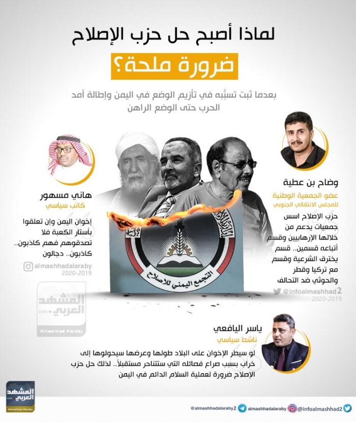 أكد سياسيون ونشطاء، على ضرورة حل حزب الإصلاح الإخواني، بعدما ثبت تسببه في تأزيم الوضع في اليمن وإطالة أمد الحرب حتى الوقت الراهن.