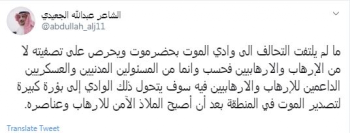 وقال في تغريدة عبر "تويتر" رصدها "المشهد العربي": "ما لم يلتفت التحالف الى وادي الموت بحضرموت ويحرص على تصفيته لا من الإرهاب والإرهابيين فحسب وإنما من المسئولين المدنيين والعسكريين الداعمين للإرهاب والإرهابيين فيه سوف يتحول ذلك الوادي إلى بؤرة كبيرة لتصدير الموت في المنطقة بعد أن أصبح الملاذ الآمن للإرهاب وعناصره".