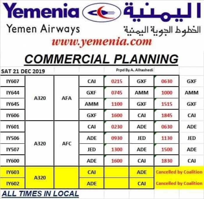 ينشر "المشهد العربي" مواعيد رحلات طيران اليمنية غداً السبت، الموافق 21 ديسمبر 2019.