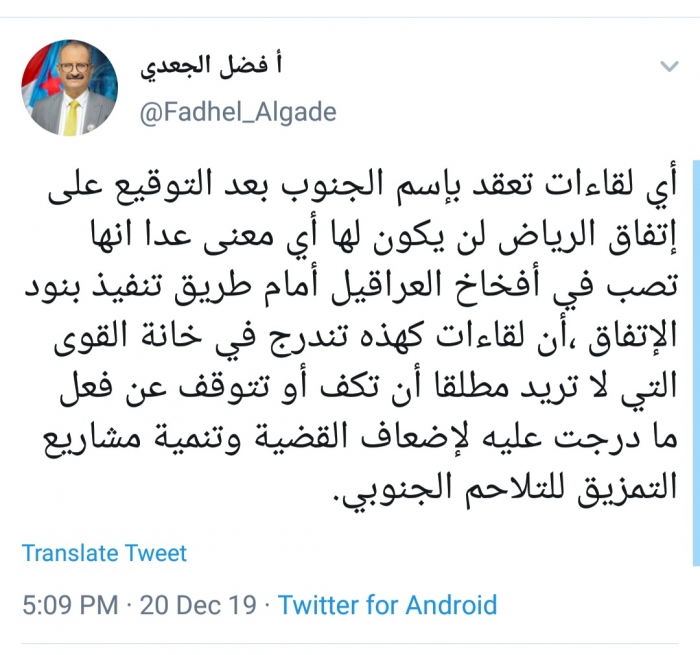 انتقد عضو هيئة رئاسة المجلس الانتقالي الجنوبي، فضل الجعدي، أي لقاءات تعقد باسم الجنوب بعد التوقيع على اتفاق الرياض.