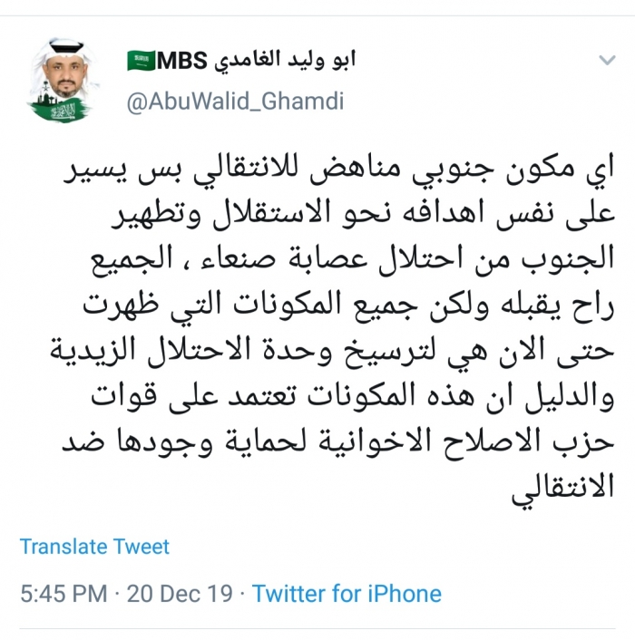 وكتب الغامدي، في تغريدة له عبر موقع التواصل الاجتماعي تويتر، تابعها المشهد العربي: "أي مكون جنوبي مناهض للانتقالي بس يسير على نفس أهدافه نحو الاستقلال وتطهير الجنوب من احتلال عصابة صنعاء، الجميع راح يقبله".