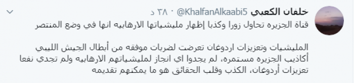 وكتب الكعبي عبر تغريدة له على "تويتر":"قناة الجزيرة تحاول زورا وكذبا إظهار مليشياتها الإرهابية إنها في وضع المنتصر".