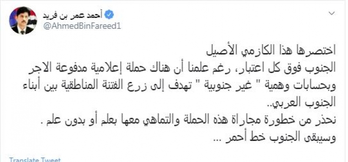 وقال في تغريدة عبر "تويتر" رصدها "المشهد العربي": "اختصرها هذا الكازمي الأصيل الجنوب فوق كل اعتبار، رغم علمنا أن هناك حملة إعلامية مدفوعة الأجر وبحسابات وهمية غير جنوبية تهدف إلى زرع الفتنة المناطقية بين أبناء الجنوب العربي.. نحذر من خطورة مجاراة هذه الحملة والتماهي معها بعلم أو بدون علم. وسيبقى الجنوب خط أحمر".